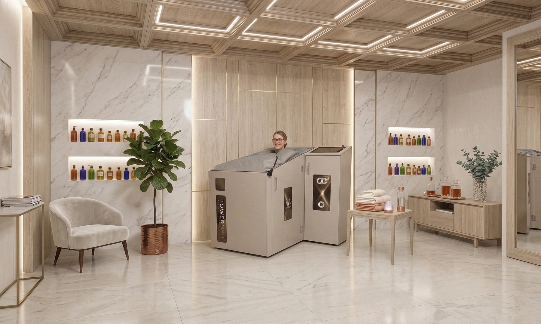 Nowa forma urządzenia łatwo wpisuje się w różne style wnętrz. TOWER MX-1 dobrze wygląda zarówno w nowoczesnym gabinecie medycznym, jak i w bardziej kameralnej strefie wellness.