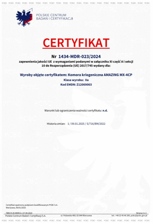 Kriokomora AMAZING MX-4CP posiada certyfikat wydany przez Polskie Centrum Badań i Certyfikacji, potwierdzający zgodność z europejskim rozporządzeniem MDR 2017/745. To gwarancja bezpieczeństwa i najwyższych standardów — zarówno dla pacjentów, jak i dla placówek medycznych i rehabilitacyjnych.
